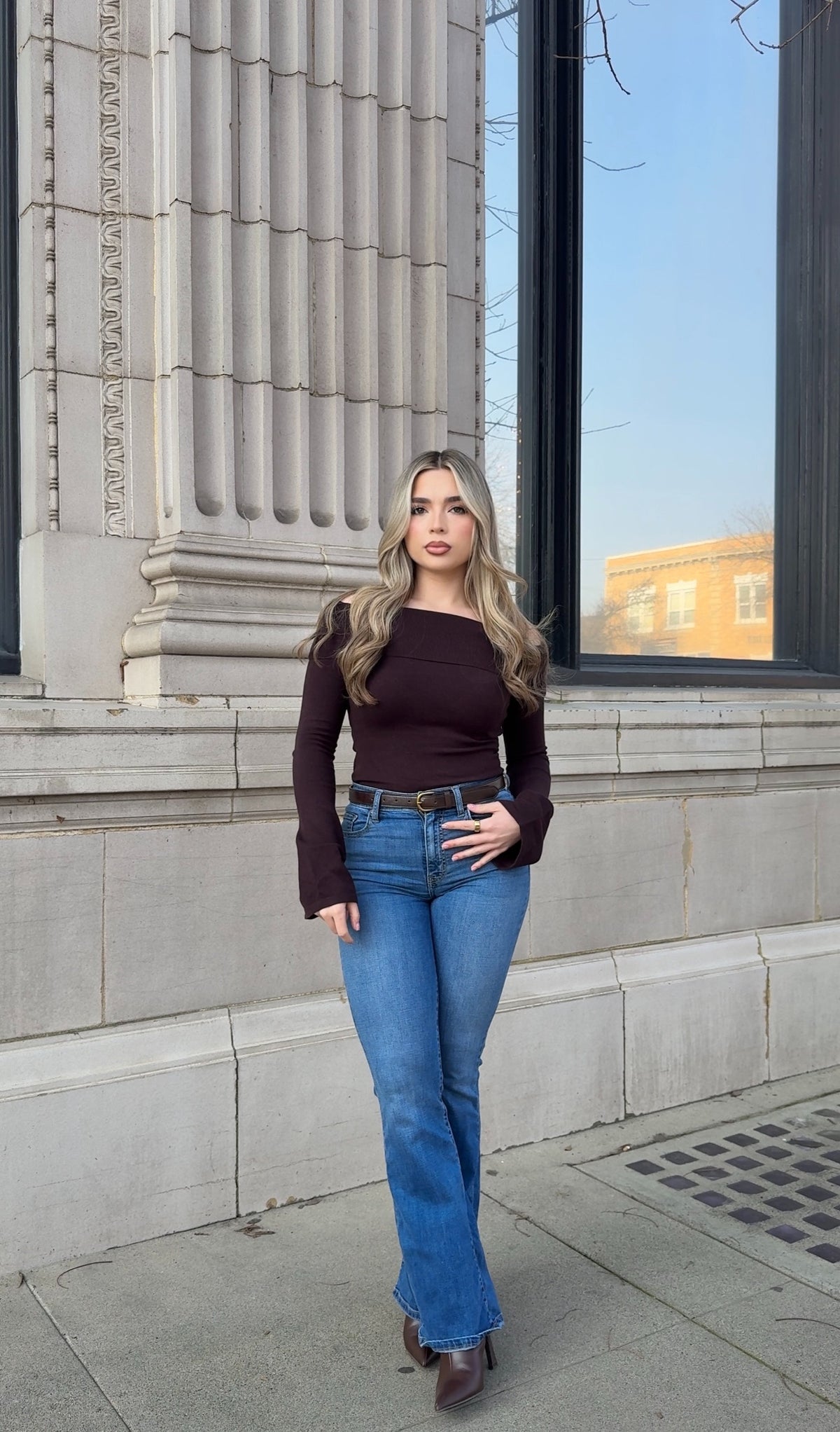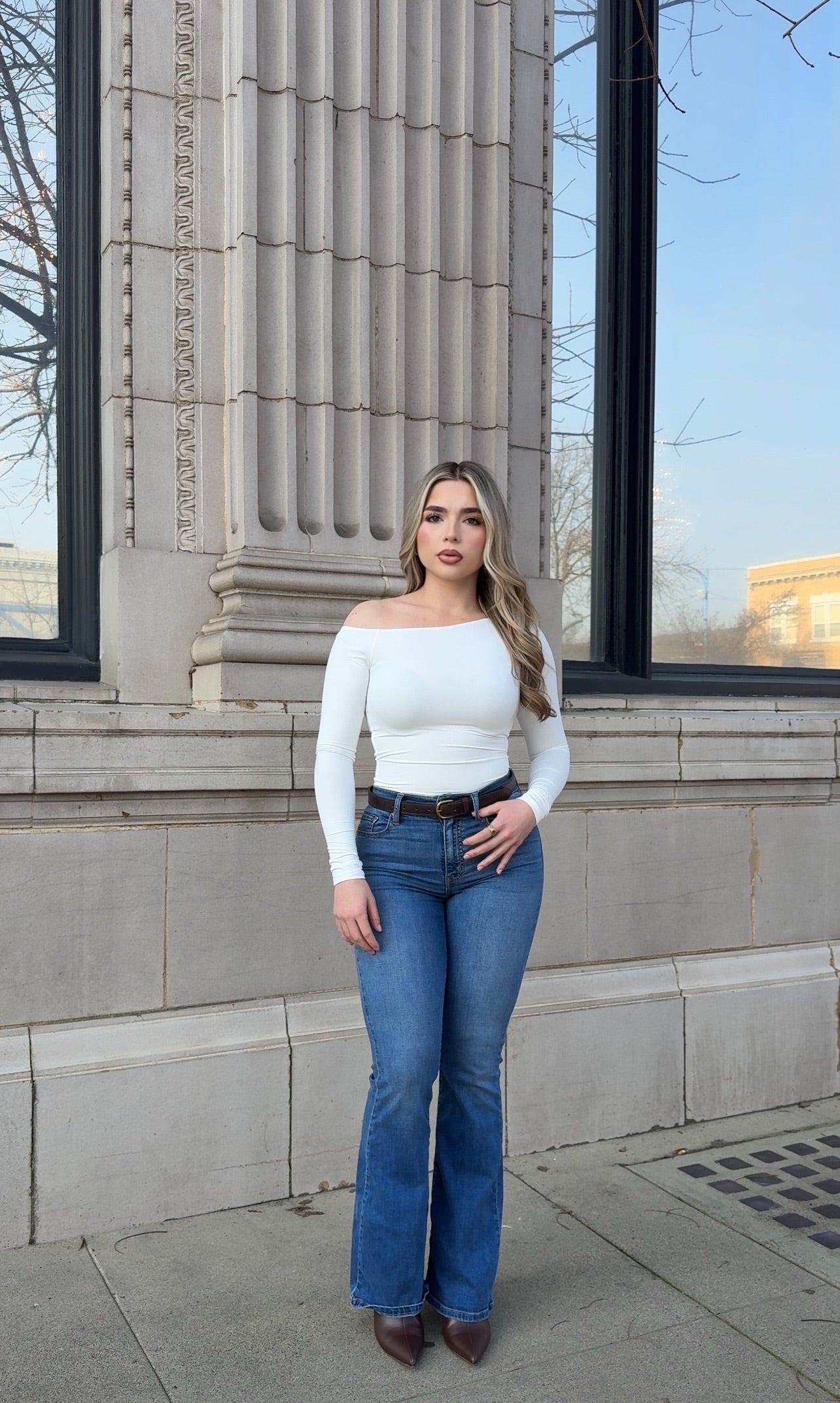 • Medium wash denim jeans